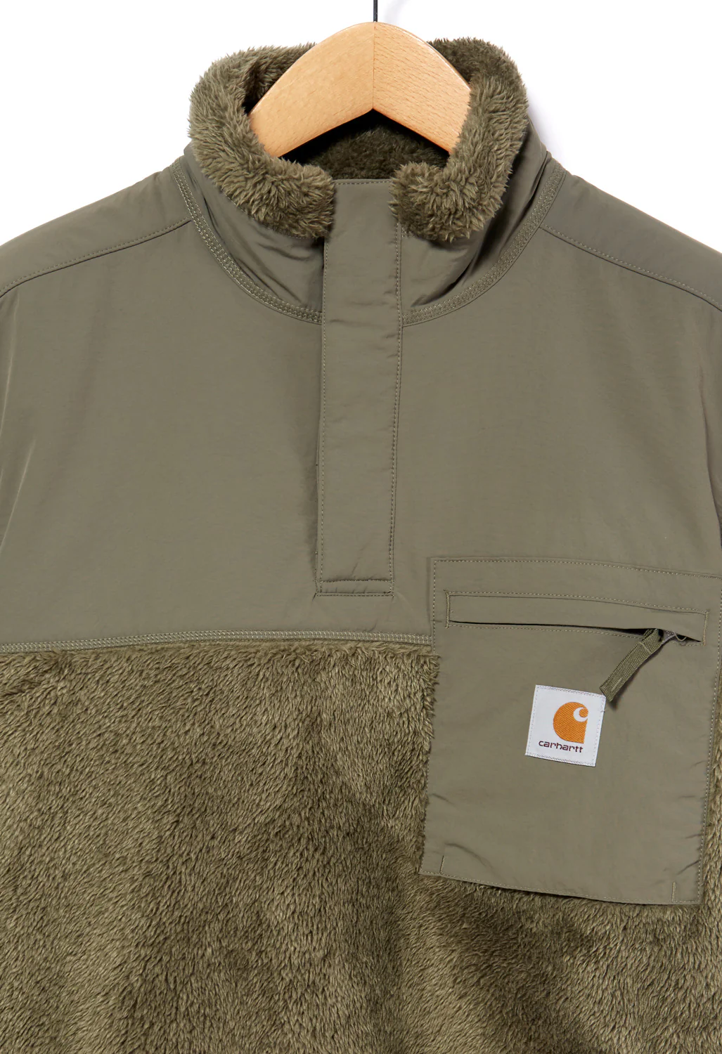 An over-the-head fleece style taking cues from heavyweights of the outdoor world. The piece is made from a polyester pile fleece with contrasting nylon panelling on the chest, back and elbows. It features a high, snap button neck a zipped chest pocket and two zipped hand pockets.