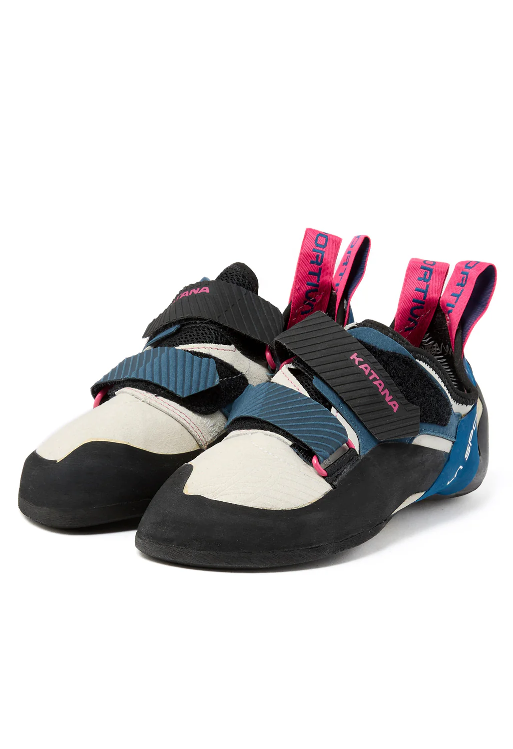 La Sportiva’s Women’s Katana is a technical climbing shoe that is versatile enough to take on long routes and boulders. It is sensitive and structured, in a women’s specific fit with a lower volume to increase precision and comfort. For those familiar with the legendary Katana, this update brings La Sportiva’s Permanent Power Platform to ensure they keep their shape even after many hours of use and a narrower heel for improved heel hooks. The opposing hook-and-loop closure straps enable a precise fit, and the upper strap pulls both the arch and heel for extra security. The microfibre and cotton elements are made with recycled materials.