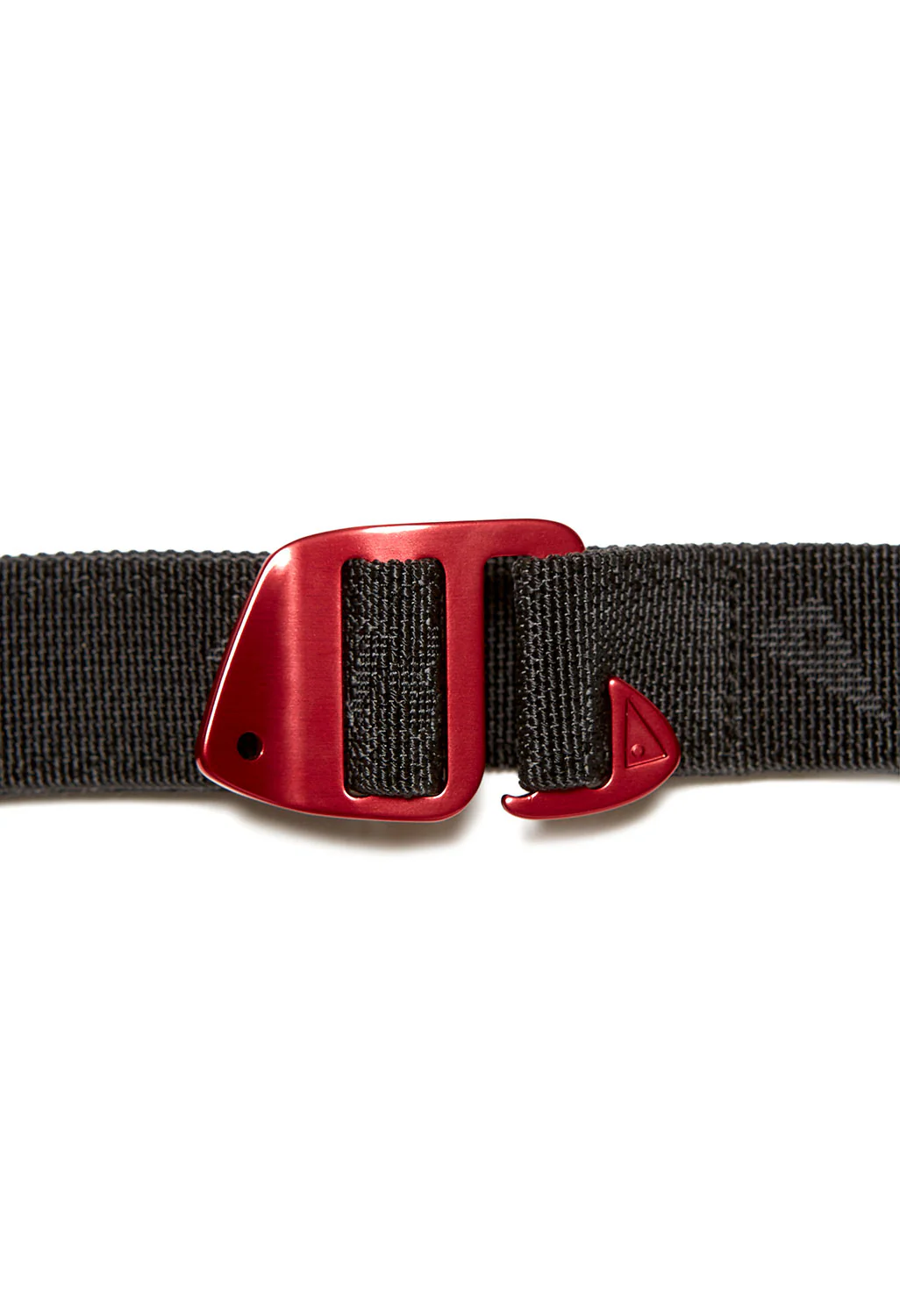 A versatile webbing belt with metal hardware, the Gjord Stretch Belt is built for long lasting use. Distinctive anodised red buckle that incorporates the cheese element of Klättermusen’s design language. Elasticated webbing with subtle woven logo and a hook-lock closure.