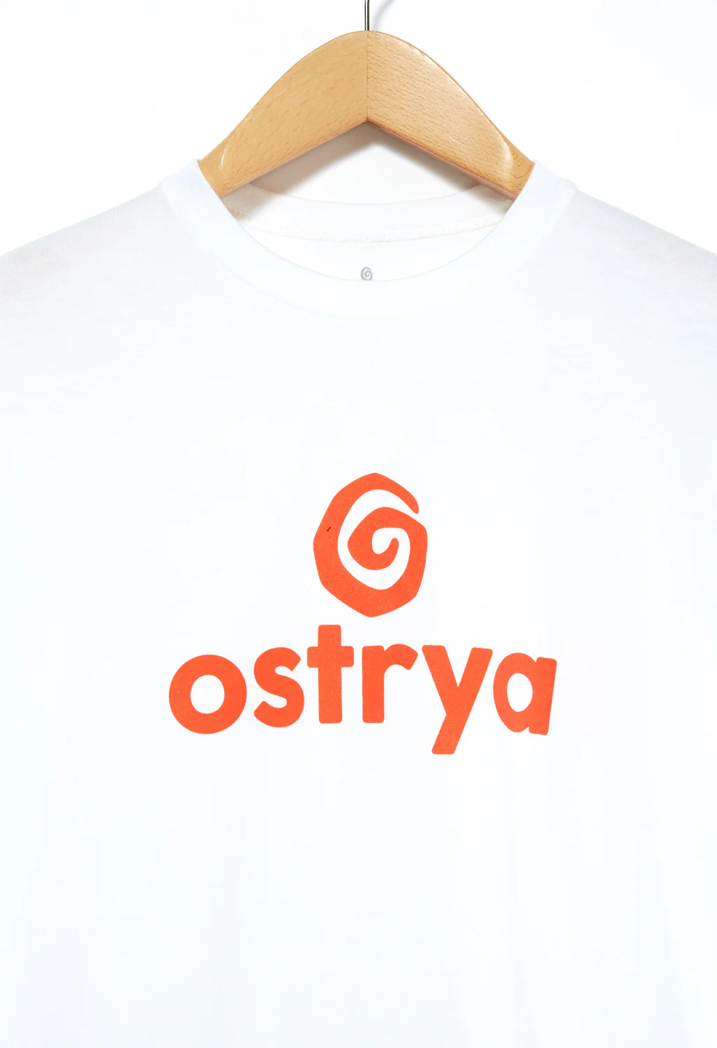 A simple poly-cotton blend tee displaying a front screen print of the Ostrya spiral logo. Made and screen printed in Canada.